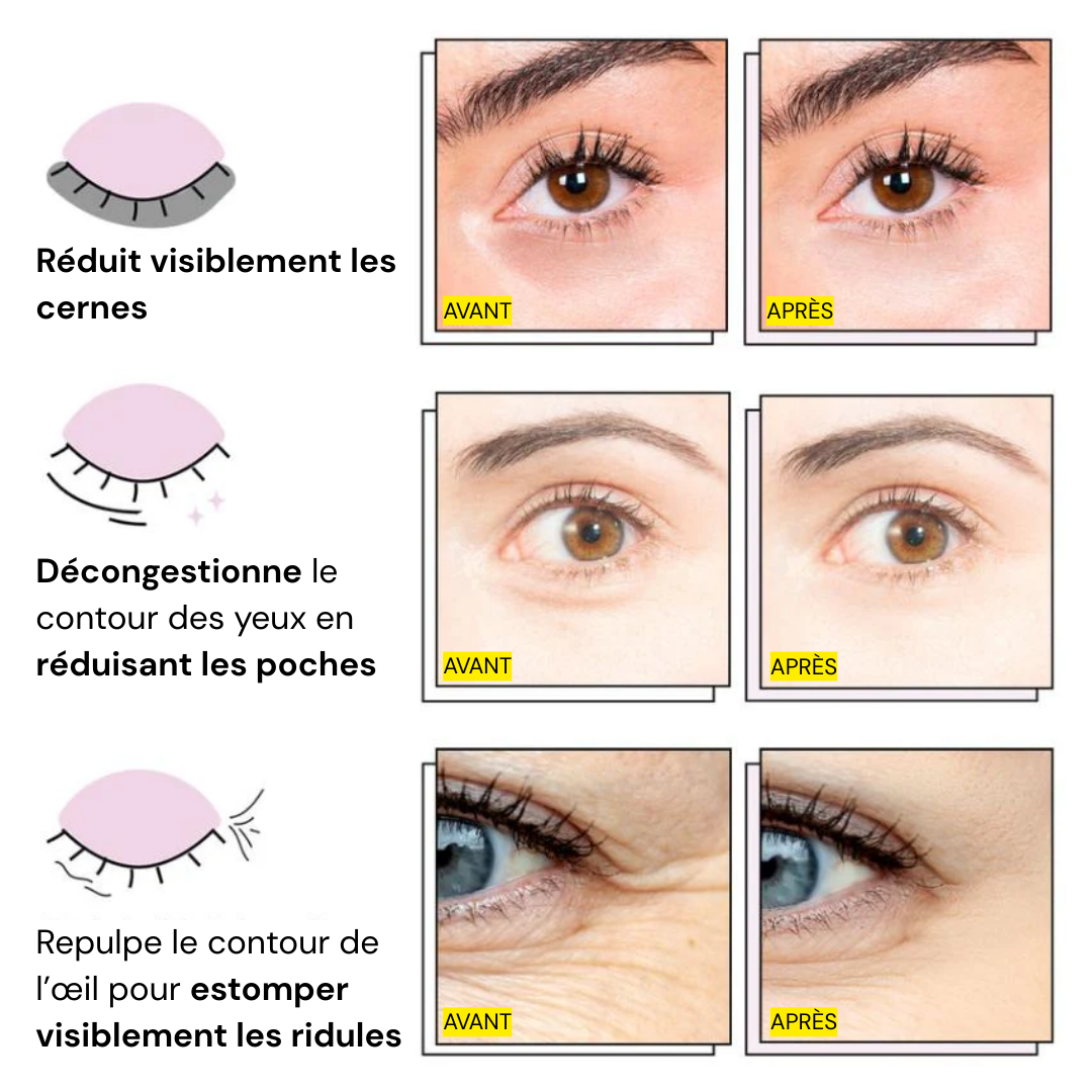 Dès la première utilisation, votre regard paraît plus reposé et vos poches sont visiblement réduites en 15 minutes. Pour des résultats durables sur les ridules, comptez 3 à 4 semaines d'utilisation régulière.